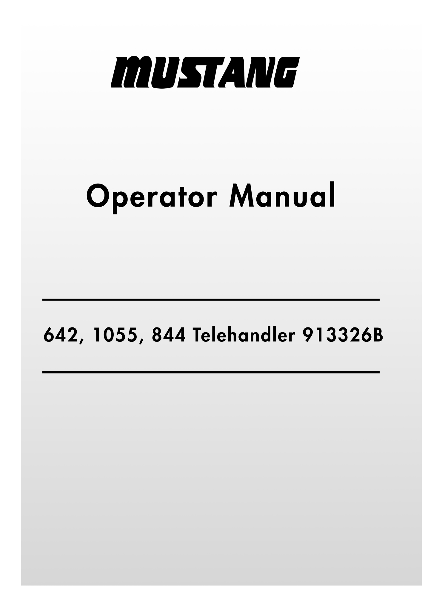 Enhance your operational efficiency with the MUSTANG 642, 1055, 844 Telehandler Operator Manual (Part No. 913326B). This comprehensive guide is designed to provide you with essential information on the safe and effective use of your telehandler, ensuring optimal performance and longevity. With clear instructions, detailed diagrams, and troubleshooting tips, this manual is an invaluable resource for operators seeking to maximize productivity and minimize downtime. Invest in your equipment's success and ensure you have the knowledge to operate with confidence.