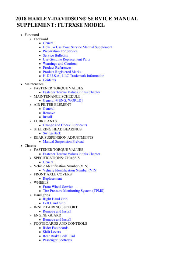 Unlock the full potential of your 2018 Harley-Davidson FLTRXSE with our comprehensive Service Manual PDF. This essential guide provides detailed instructions, diagrams, and troubleshooting tips to ensure your motorcycle runs smoothly and efficiently. Whether you're a seasoned mechanic or a DIY enthusiast, this manual empowers you to perform maintenance and repairs with confidence, saving you time and money. Don't miss out on the opportunity to keep your ride in top condition download your copy today and hit the road with peace of mind!