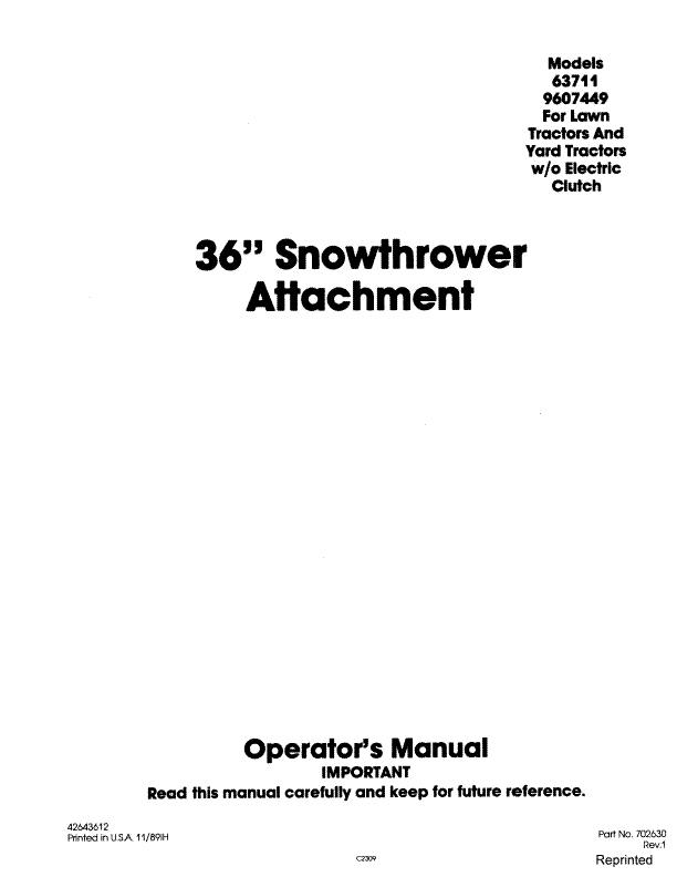 Models 36 Inch Snow Thrower lawn and yard Tractors without Electric Clutch - New Holland operator's Manual 42643612