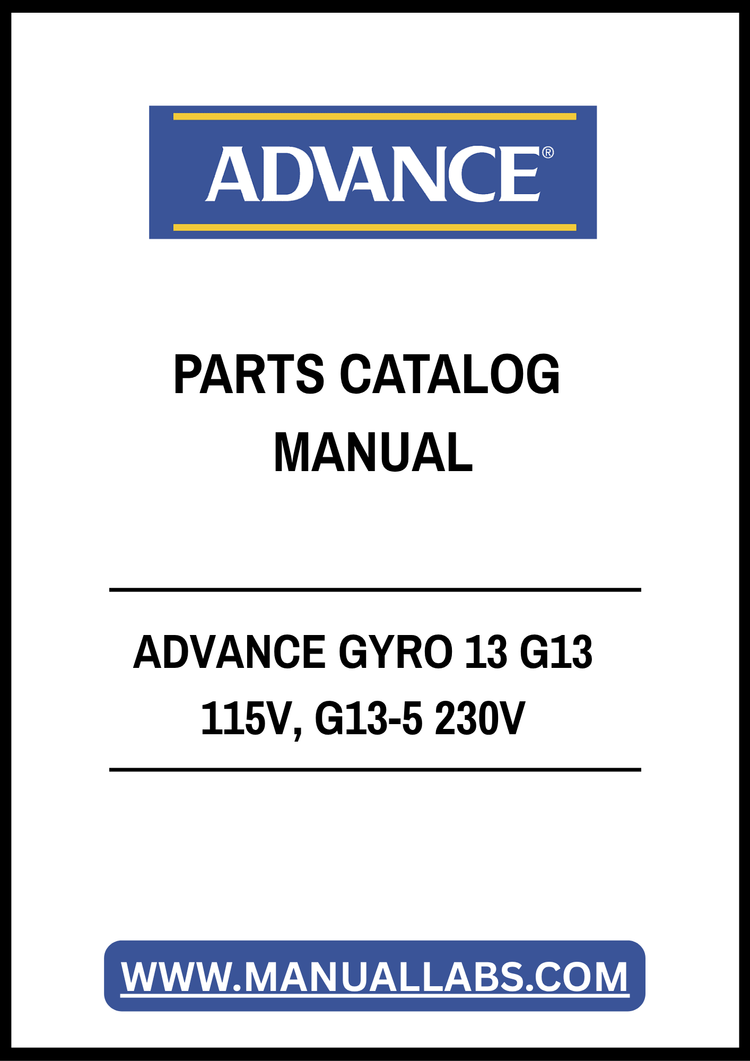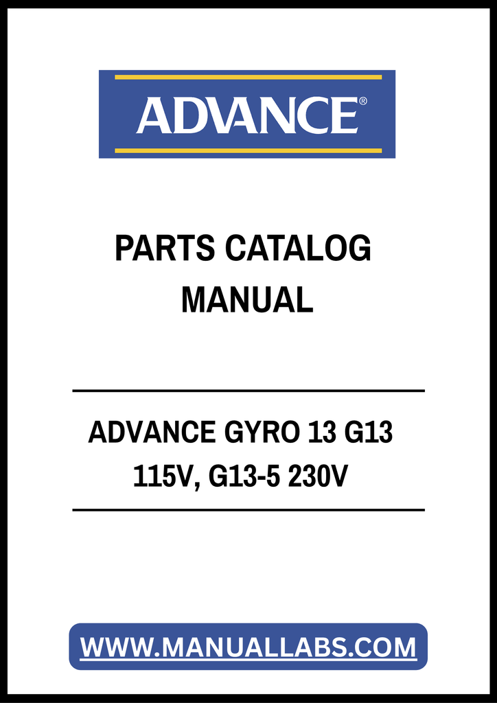 1. Discover the comprehensive ADVANCE GYRO 13 G13 115V, G13-5 230V Parts Catalog Manual, available in a convenient PDF format. This essential resource is designed for technicians and maintenance professionals, providing detailed information on parts and specifications for optimal performance of your equipment.