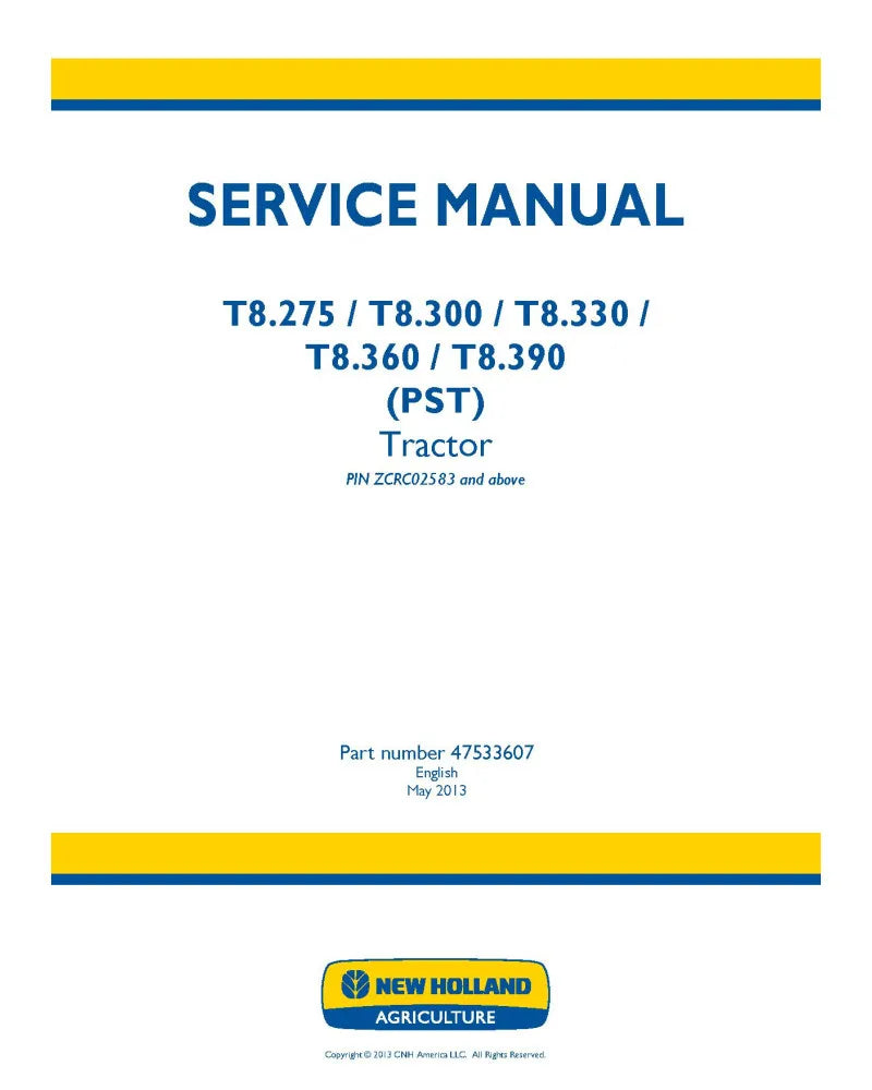 UNLOCK THE FULL POTENTIAL OF YOUR NEW HOLLAND T8 SERIES TRACTOR WITH OUR COMPREHENSIVE SERVICE MANUAL, AVAILABLE IN PDF FORMAT. THIS ESSENTIAL GUIDE COVERS MODELS T8.275, T8.300, T8.330, T8.360, AND T8.390, PROVIDING YOU WITH DETAILED INSIGHTS INTO MAINTENANCE, TROUBLESHOOTING, AND REPAIR PROCEDURES.