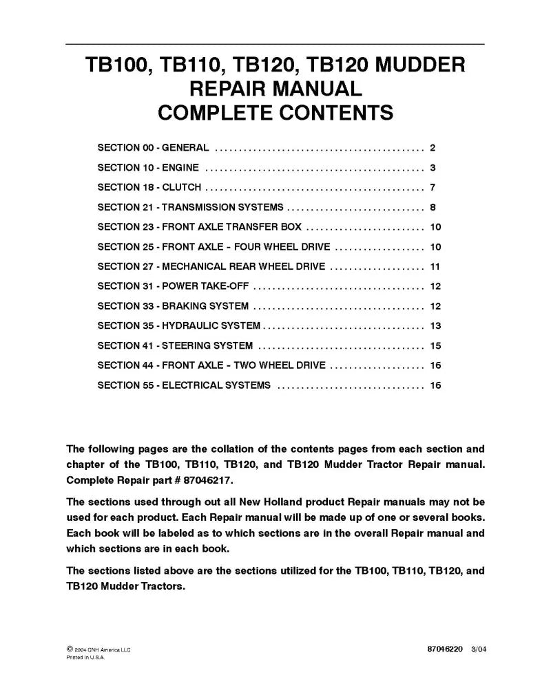 UNLOCK THE FULL POTENTIAL OF YOUR NEW HOLLAND TB100, TB110, AND TB120 MUDDER TRACTOR WITH OUR COMPREHENSIVE REPAIR MANUAL IN PDF FORMAT. THIS ESSENTIAL GUIDE PROVIDES DETAILED INSTRUCTIONS, DIAGRAMS, AND TROUBLESHOOTING TIPS TO HELP YOU MAINTAIN AND REPAIR YOUR TRACTOR EFFICIENTLY. WHETHER YOU'RE A SEASONED MECHANIC OR A DIY ENTHUSIAST, THIS MANUAL ENSURES YOU HAVE THE KNOWLEDGE AND RESOURCES TO KEEP YOUR EQUIPMENT RUNNING SMOOTHLY, SAVING YOU TIME AND MONEY ON REPAIRS. DON'T LET MECHANICAL ISSUES SLOW YOU DOWN—DOWNLOAD YOUR REPAIR MANUAL TODAY AND GET BACK TO WORK WITH CONFIDENCE!